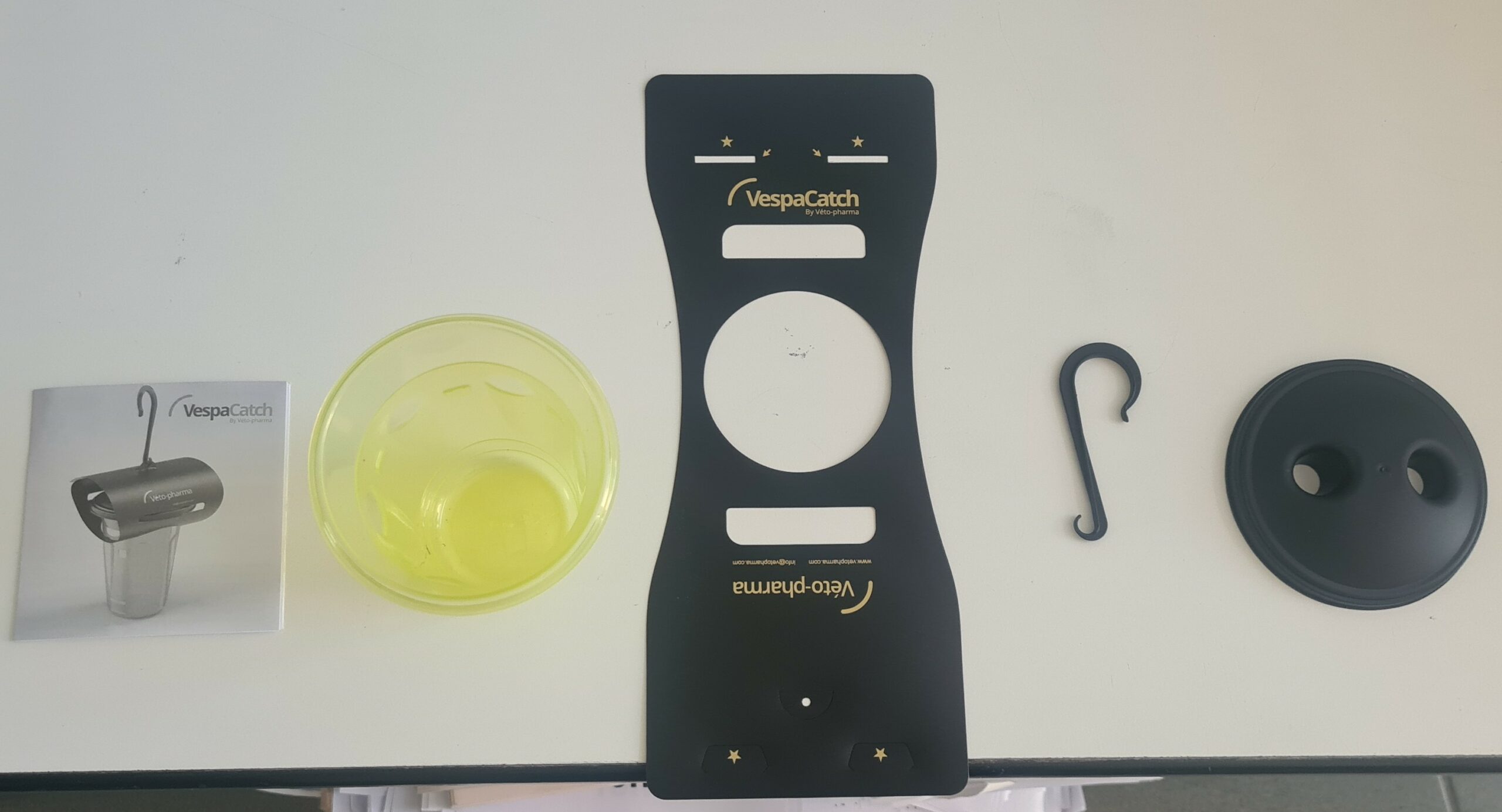 Le piège est composé d’un bol en plastique jaune, d’un couvercle avec deux puits d’entrée et d’un tunnel concentrant les odeurs, masquant la lumière et empêchant la sortie des insectes piégés.
